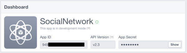 Create a new app on the developers page of Facebook (again, the name is your choice). Once you've done that, you'll be presented with the dashboard view of the Facebook app. In this view copy the APP ID and the APP SECRET keys and, in your XCode project, navigate to the Info.plist file, which is in the SocialNetwork > Supporting Files folder in the project navigator.