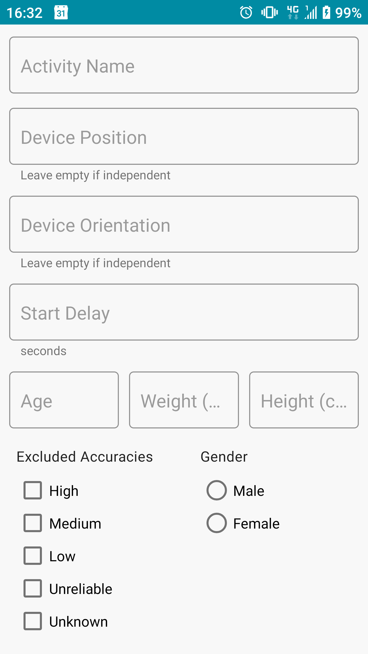 - Selected sensors data are logged in background along with optional user input (activity name, phone location, phone orientation)