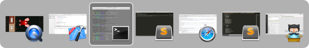 Switch is a window-based (as opposed to application-based) context switcher. By default it is bound to using ⌥⇥ and ⌥⇧⇥ to cycle through the visible windows on the current space. When the interface is active, ⌥W can be used to close windows and ⌥, used to show a preferences window. The main interface looks like this: