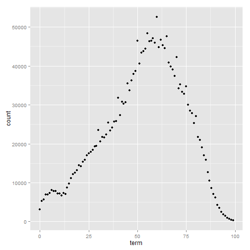qplot(x=term, y=count, data=patient_ages)You can filter the results to count on using the fda_filter() method: